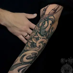 Татуировка мужская нео-япония на предплечье кицунэ и сакура (Денис Марченко) 8880