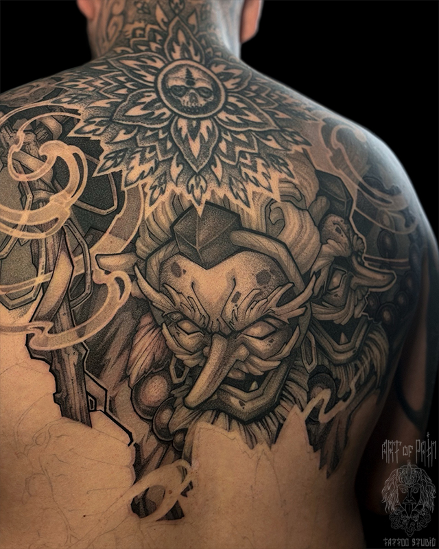 Татуировка мужская нео-япония на спине тэнгу (Денис Марченко) 8882