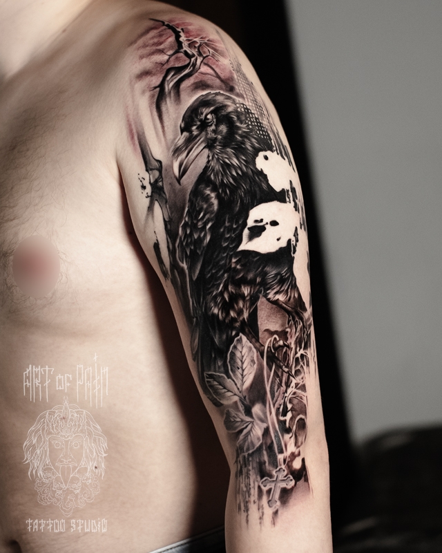 Татуировка мужская реализм на плече ворон в листьях (Дмитрий Шейб) 8908