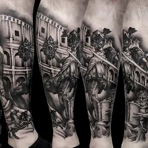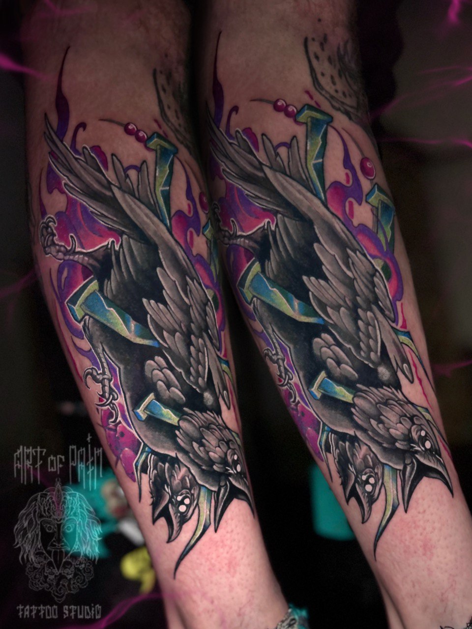 Татуировка мужская нью скул на голени ворон и гвозди (Кирилл Плотников) 8911