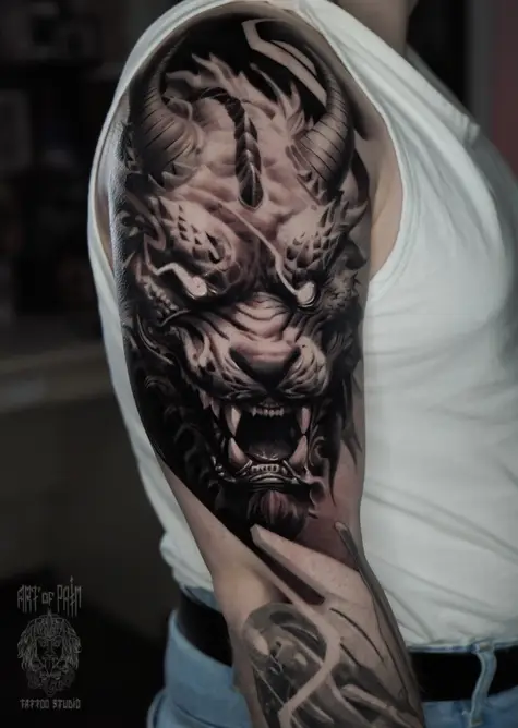 Татуировка мужская реализм на плече дракон в дыму 8926