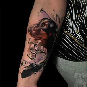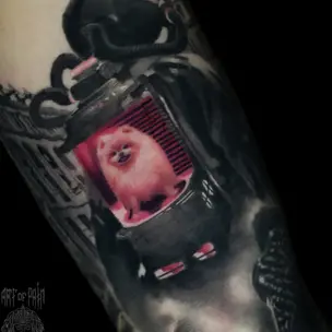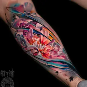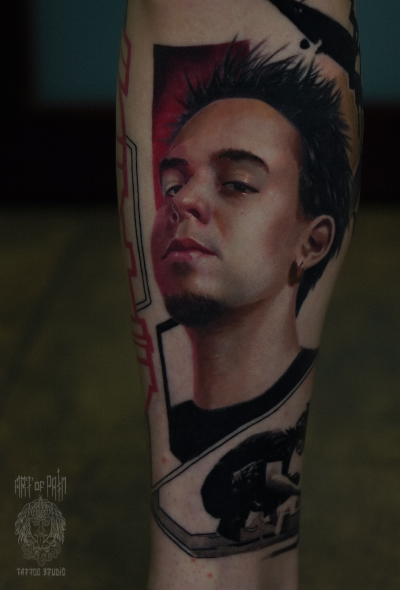 Татуировка мужская цветной реализм на икре Майк Шинода (Александр Pusstattoo) 8928