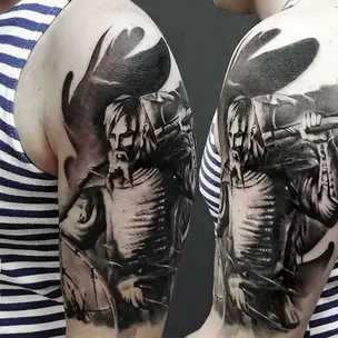 Татуировка мужская black&grey на бицепсе полководец (Александр Pusstattoo) 8934