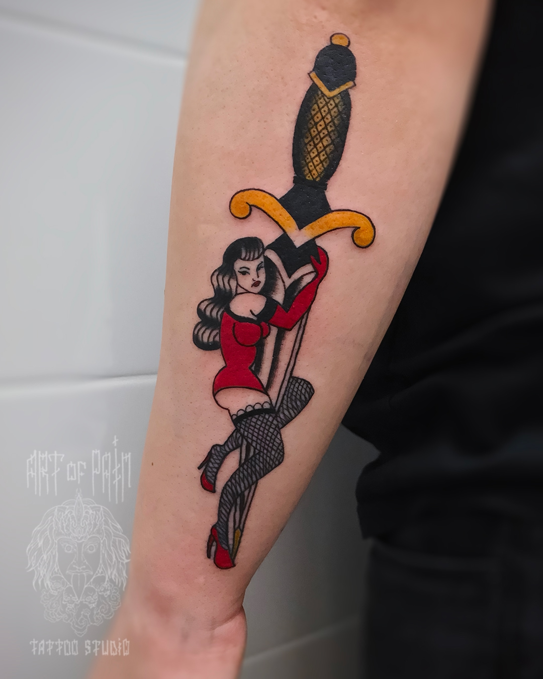 Татуировка мужская олд скул на руке девушка и кинжал (Елизавета Пилипенко ) 8961