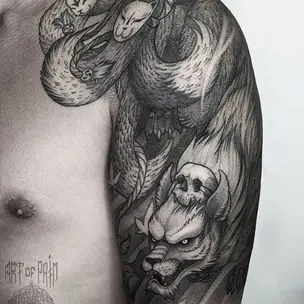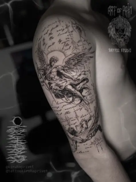 Татуировка мужская графика на плече два ангела и надписи (Кирилл Плотников) 9004