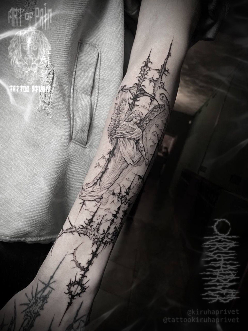 Татуировка мужская графика на предплечье ангел и готика (Кирилл Плотников) 9005