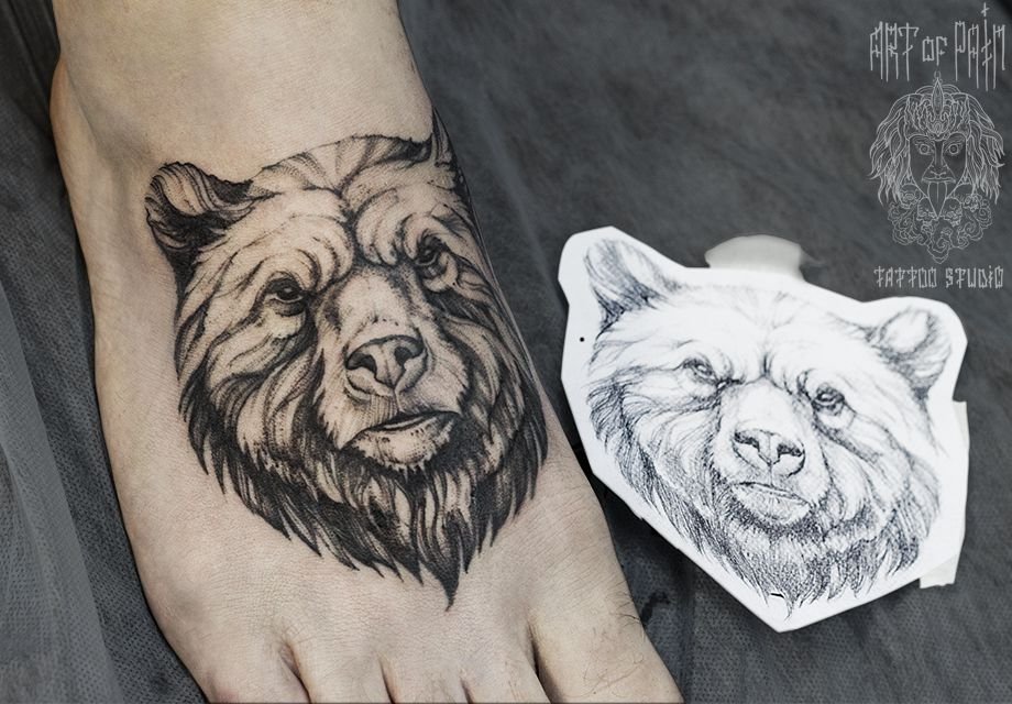 Татуировка мужская графика на ноге голова медведя 925
