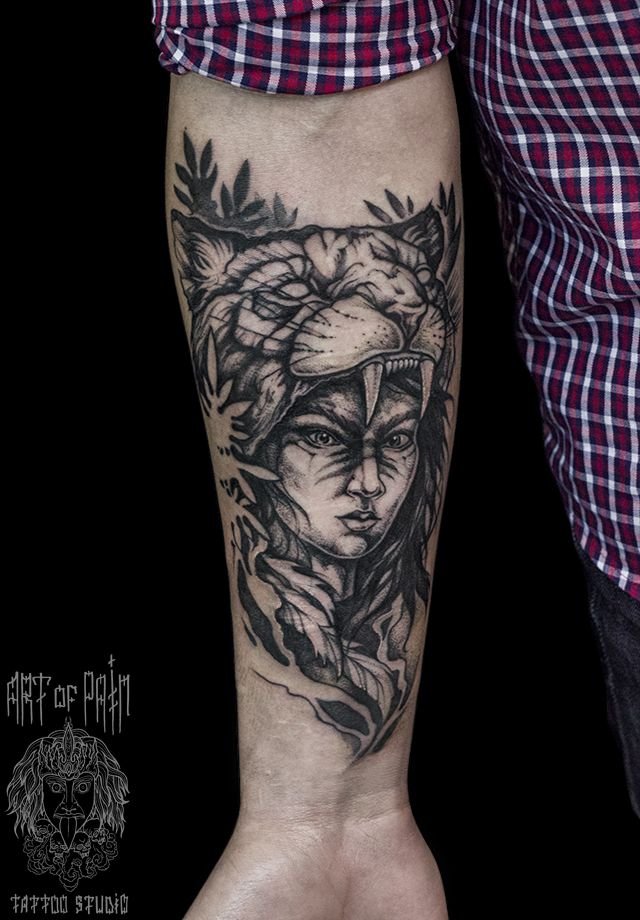 Татуировка мужская графика на предплечье девушка в шкуре рыси 932