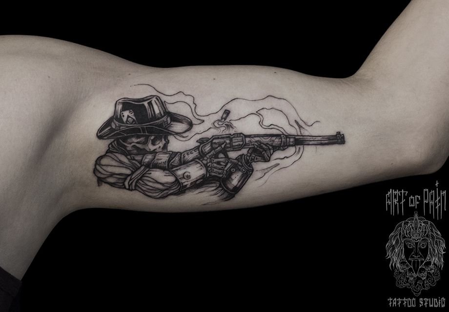 Татуировка мужская графика на бицепсе скелет 937