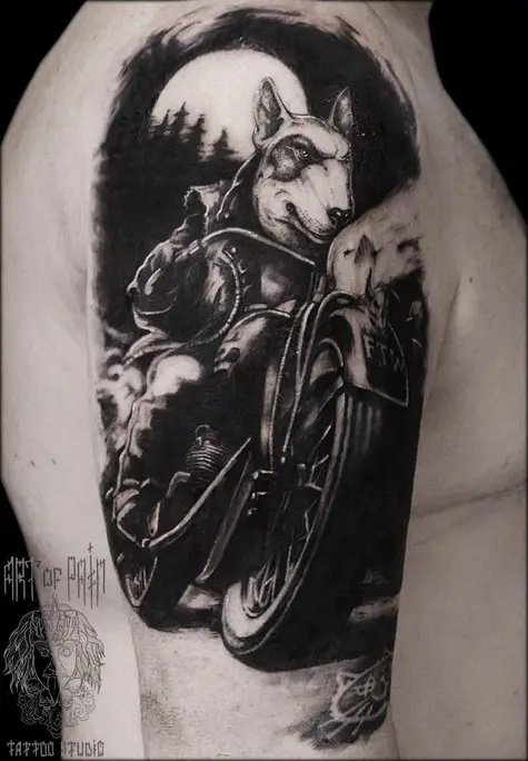 Татуировка мужская графика на плече собака на мотоцикле 940