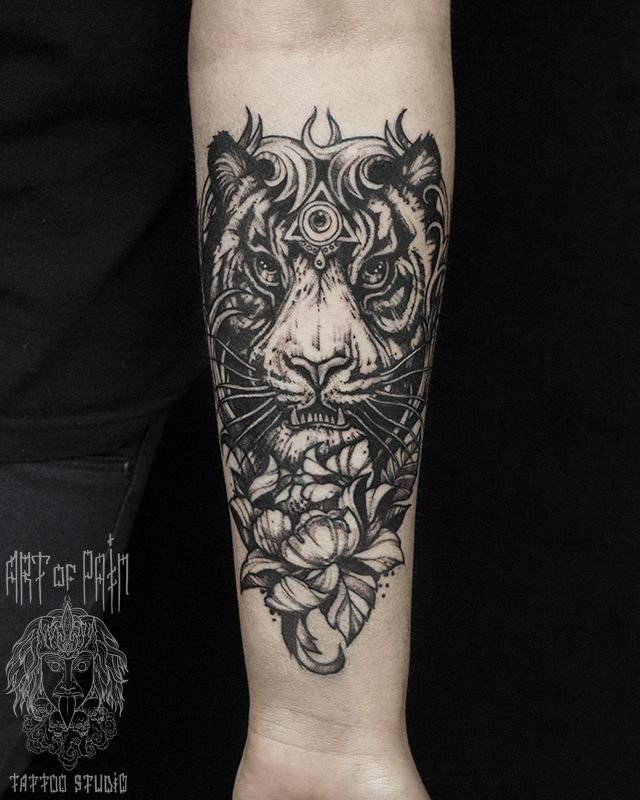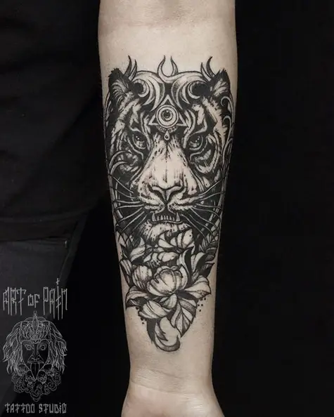 Татуировка мужская графика на предплечье тигр и цветок 946