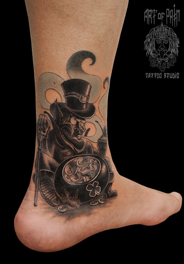 Татуировка мужская Black&Grey на щиколотке леприкон 949