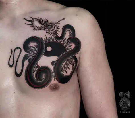 Татуировка мужская графика на груди змея 958