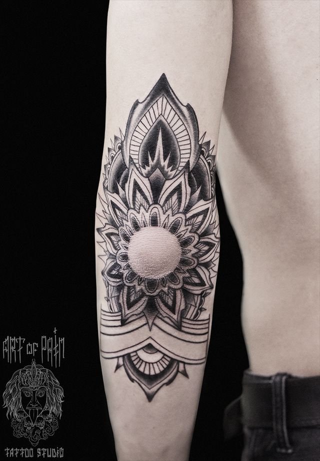 Татуировка мужская графика на локте мандала 963