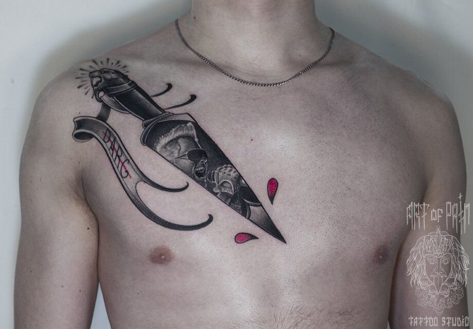 Татуировка мужская графика на груди нож и портрет 968