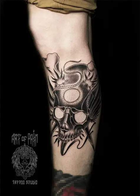 Татуировка мужская графика на икре череп 988