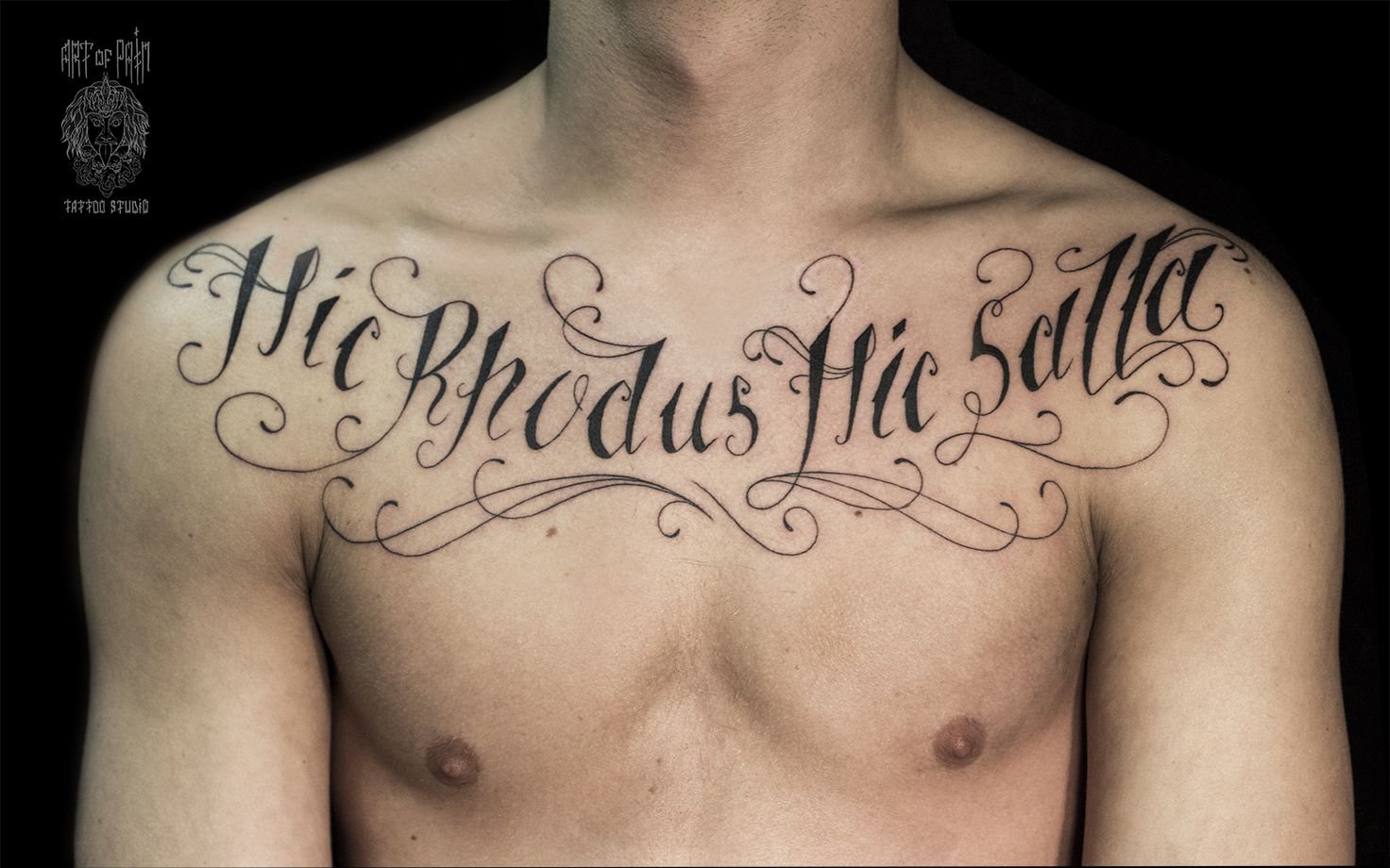Татуировка мужская каллиграфия на груди надпись на латыни 990