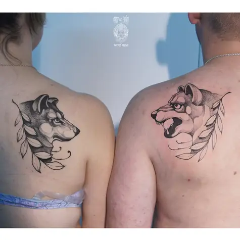 Татуировки парные на лопатках в стиле графика волки и лавр 646