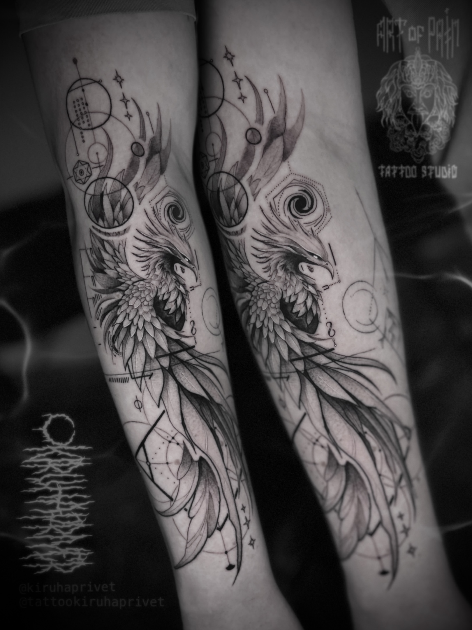 Мужские татуировки Мастер Кирилл Плотников Вид тату Феникс Стиль тату Графика Место нанесения Тату на предплечье Цвет Чёрно-белые Хочу такую же тату Другие работы мастера Тату в стиле Графика Тату на предплечье