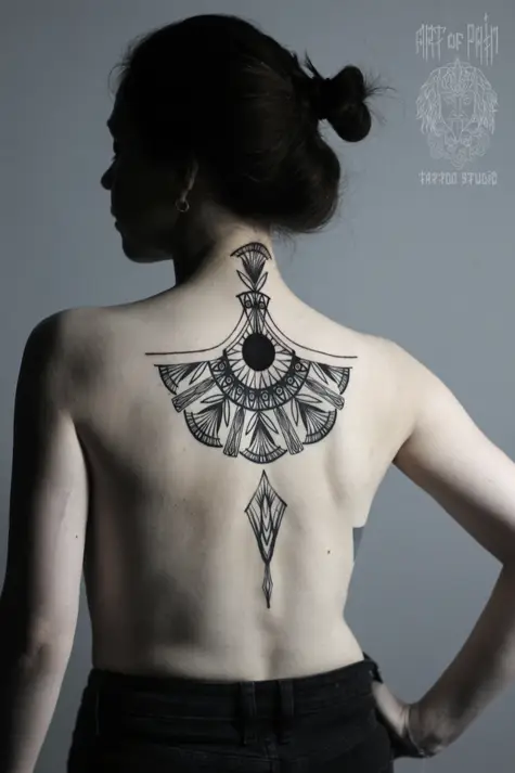 Женские татуировки Мастер Надежда Полякова Вид тату Узор Стиль тату Графика Место нанесения Тату на спине Цвет Чёрно-белые Хочу такую же тату Другие работы мастера Тату в стиле Графика Тату на спине