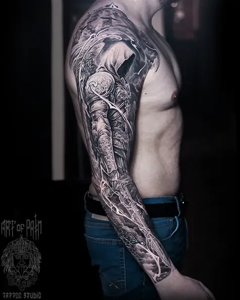 Мужские татуировки Мастер Слава Tech Lunatic Вид тату Воин Стиль тату Black&Grey Место нанесения Тату-рукав Цвет Чёрно-белые Хочу такую же тату Другие работы мастера Тату в стиле Black&Grey Тату-рукав
