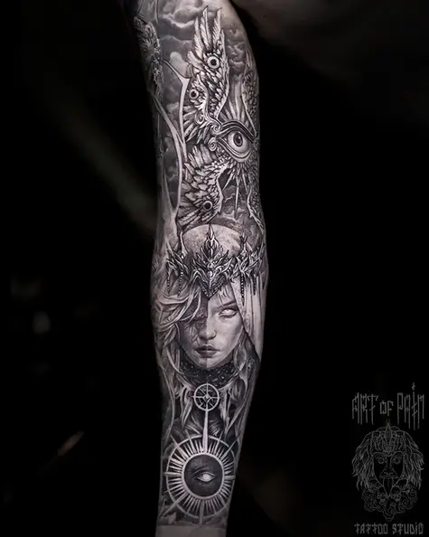 Мужские татуировки Мастер Слава Tech Lunatic Вид тату Девушка Глаз Стиль тату Black&Grey Место нанесения Тату-рукав Цвет Чёрно-белые Хочу такую же тату Другие работы мастера Тату в стиле Black&Grey Тату-рукав