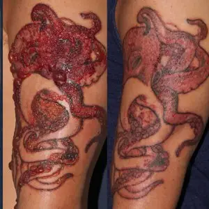 Аллергия на татуировку может возникнуть не сразу, а на третьей процедуре или спустя год. Она проявляется в виде аллергического дерматита, отечности кожи вокруг рисунка, может сопровождаться затрудненным дыханием. Возникает сыпь, шелушение, иногда появляются язвы. В отличие от процесса заживления, при аллергии кожа зудит, появляются волдыри.