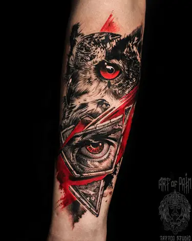 Неподражаемая треш полька находится на пике тату-моды. В таких татуировках сочетаются графика и классические рисунки, реализм и небрежность, сумбурность и четкость линий. Их выполняют в темных тонах, которые усиливают эффект глубины. Преимущественно выбирают черный и красный цвета, которые подчеркивают контрастность друг друга и создают шоковый эффект.