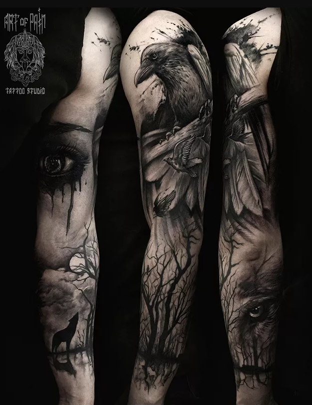 Птица символизирует одиночество и печаль, демонстрирует отрешенность от суеты жизни. Если изображен ворон на ветке, это может указывать на утрату жизненного ориентира. Когда в композиции превалирует темный фон, можно рассматривать татуировку как символ потери смысла жизни.