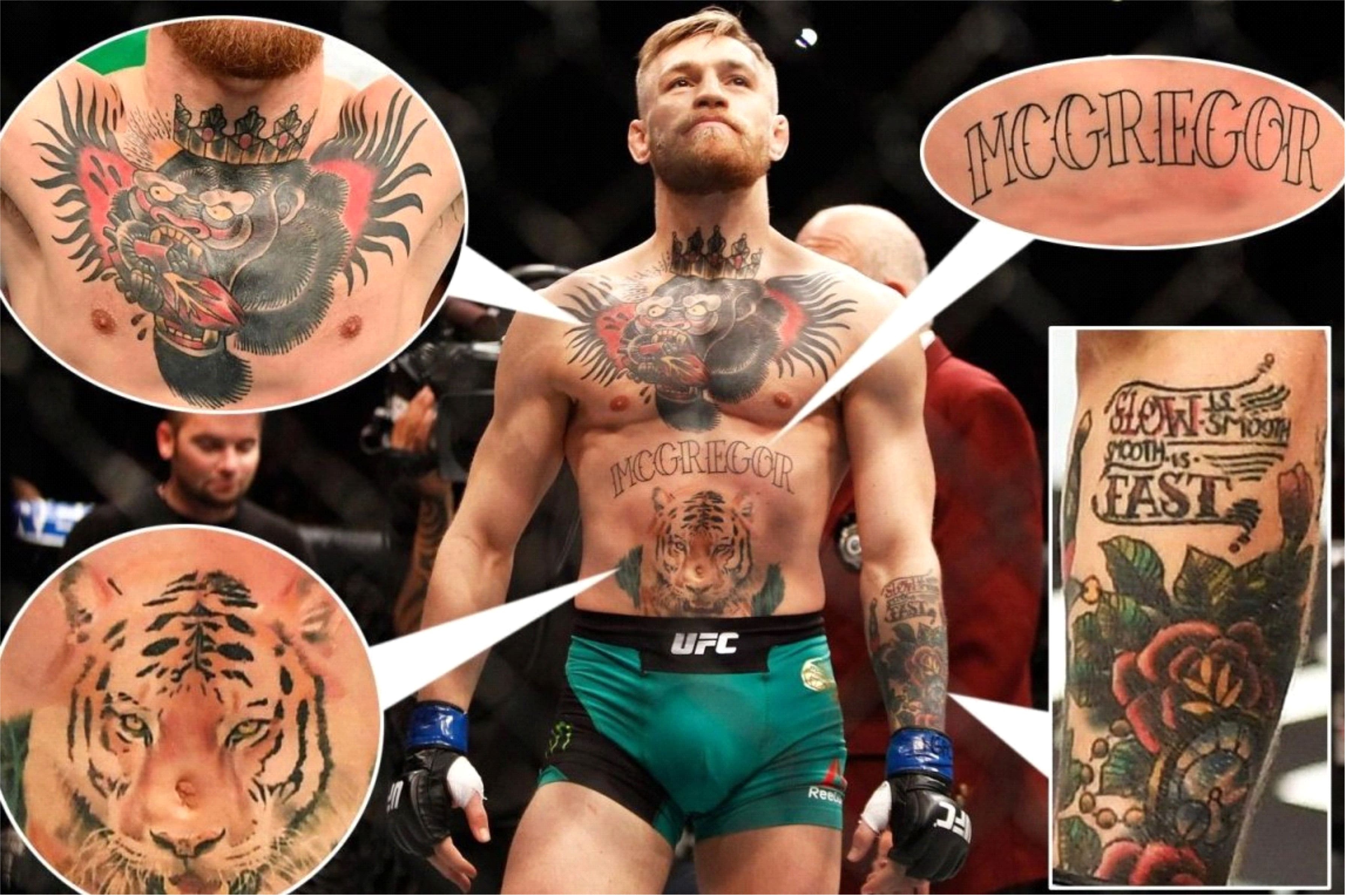 На груди расположено самое агрессивное тату Конора Макгрегора. Коронованная голова черной гориллы пожирает человеческое сердце. На самом деле, это просто эмблема клуба единоборств в Дублине, родном городе бойца. Сам он говорит, что набил ее только потому, что ему нравится рисунок. Но своеобразный знак уважения к месту, где началась его карьера, тут очевиден. К тому же агрессивный смысл прекрасно сочетается с ММА, которые часто называют боями без правил.