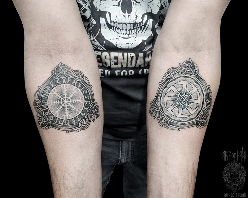 Символы имеют как славянское, так и скандинавское происхождение. Считается, что выбирать руну для татуировки надо подсознанием, то есть набивать тот символ, который понравился больше других.