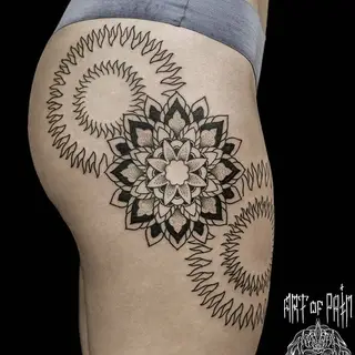 В портфолио большинства профессиональных мастеров можно найти фото тату в виде надписи или рисунка на бедрах. Это одна из самых удачных зон для размещения рисунка. Структура кожи, большая площадь поверхности позволяют набить практически любую картинку. Особенно татуировки на бедре подходят девушкам. Они помогают спрятать недостатки фигуры, визуально сделать ноги стройнее.
