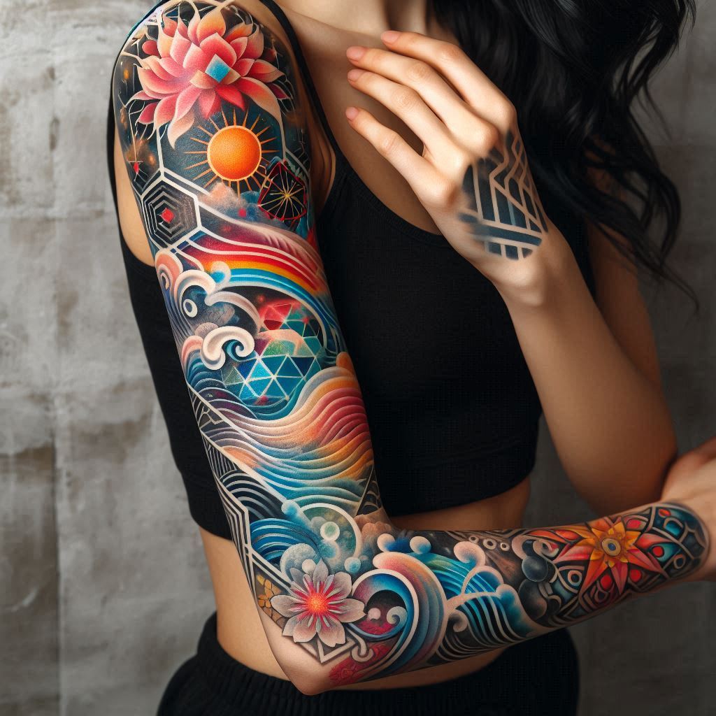Эскизы тату в стиле абстракции можно вписать в разные композиции, дополнить разнообразными вспомогательными элементами. Например, начав с небольшой картинки, можно постепенно забить целый рукав из деталей, дополняющих друг друга. Мужские и женские тату-абстракции смотрятся одинаково хорошо.