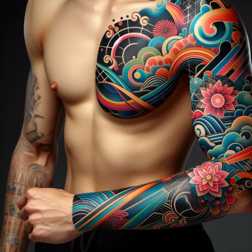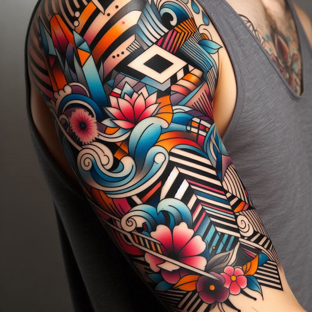 Достаточно часто парни и девушки полностью забивают руку тату в стиле абстракции. Яркие иллюстрации наиболее гармонично смотрятся в крупных изображениях. Мелкие картинки не раскрывают особенности жанра в полном объеме.