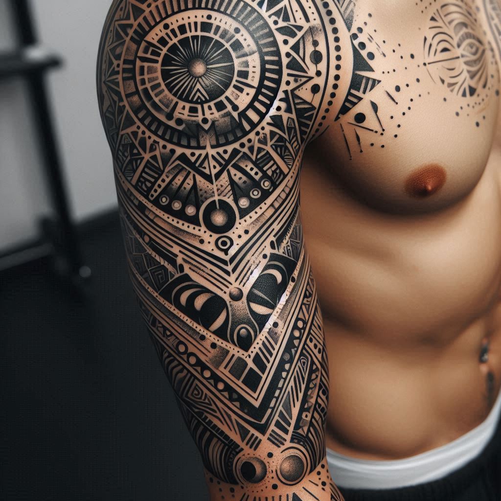 Мужчины чаще выбирают тату в стиле абстракции в виде орнамента, этнических узоров. Обычно парни набивают крупные композиции, гармонично заполняющие грудь, плечо, предплечье. Такие картины отлично подчеркивают развитую мускулатуру. Их можно сделать в технике дотворк или классики. Строгие, резкие контуры рисунков подходят парням, обладающим твердым характером, некоторой долей агрессивности.