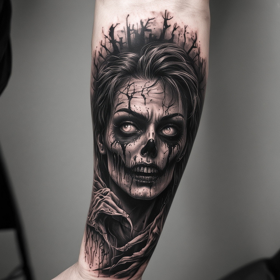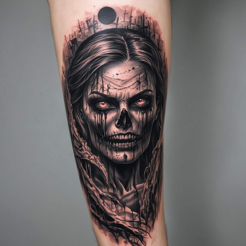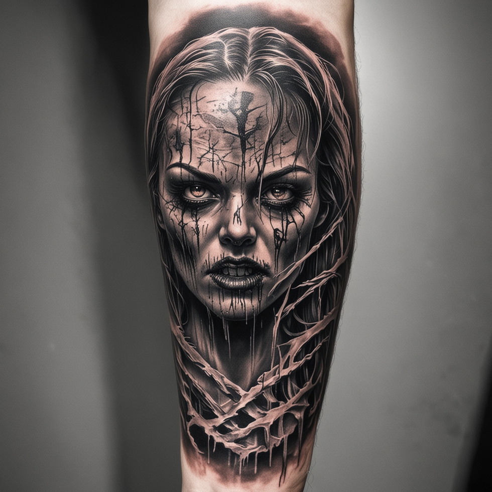 В интернете, как и в нашей «Галерее», можно увидеть фото самых разных тату в стиле хоррор: зомби, вампиры, персонажи из классических фильмов ужасов. Это направление также включает страшные портреты, реалистичную органику, когда мастер рисует разорванную кожу, торчащие кости и мышцы, внутренности, стекающую кровь. Некоторые предпочитают нарисовать грубый шов на шее или груди, отверстия от пуль на спине с кровоподтеками. Стиль также включает мистические картинки: привидения, ведьмы, кладбище в густом тумане.