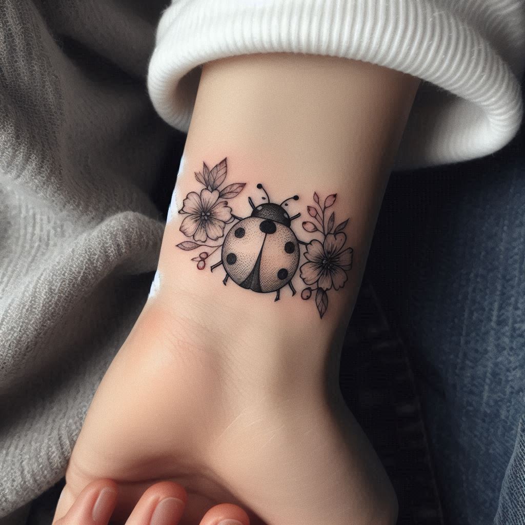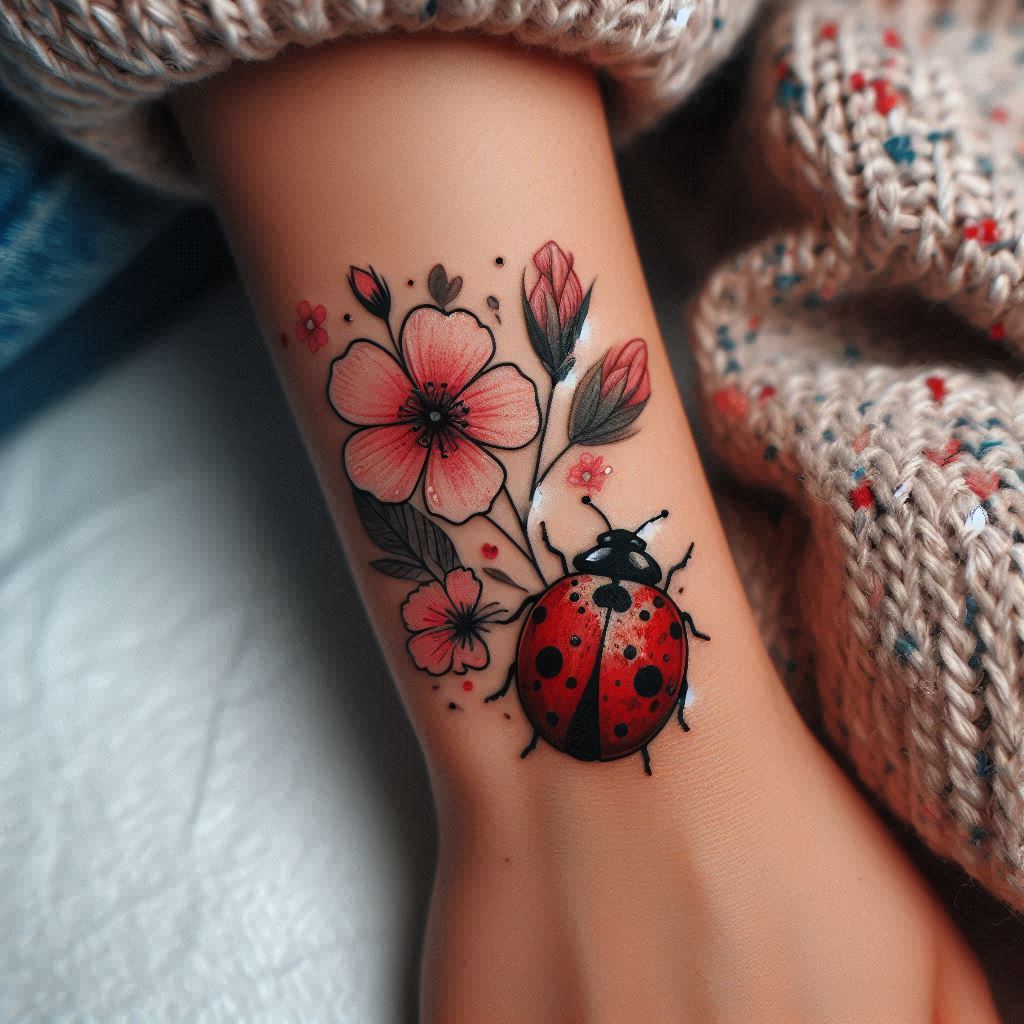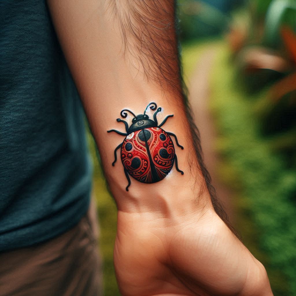 - Отдельное тату – божья коровка в нем будет центральным персонажем, а располагают его обычно на запястье или на ноге.