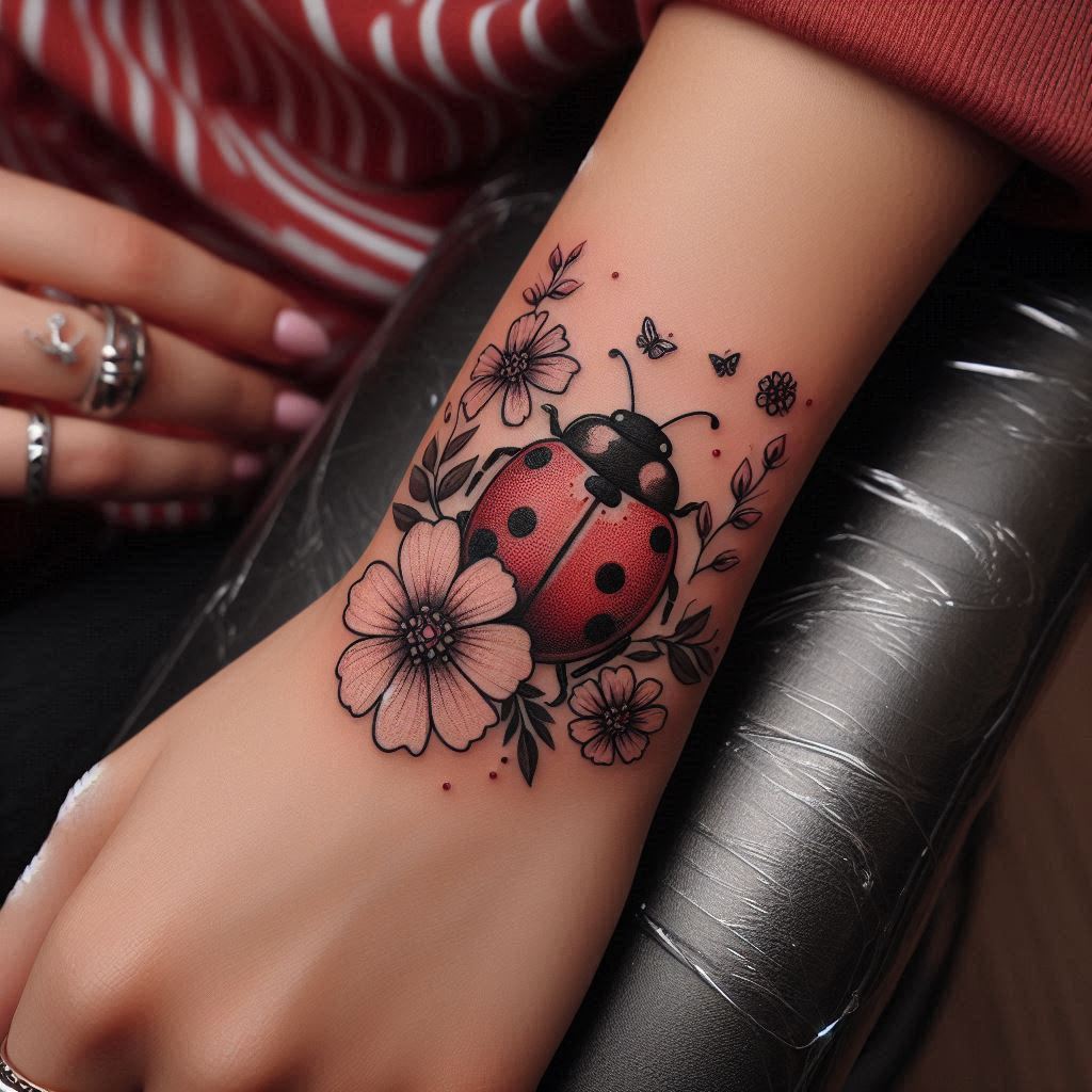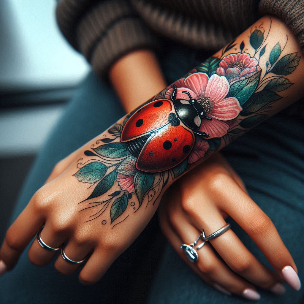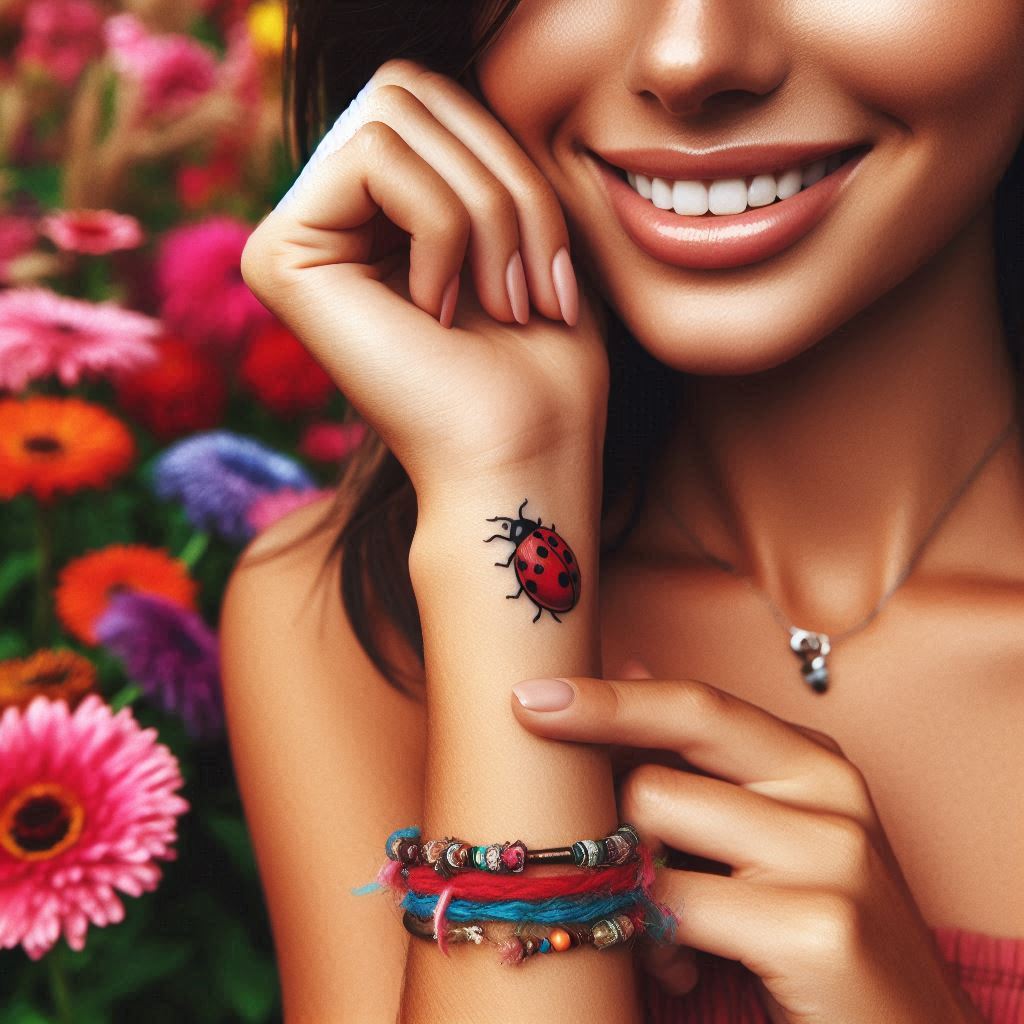 - Отдельное тату – божья коровка в нем будет центральным персонажем, а располагают его обычно на запястье или на ноге.