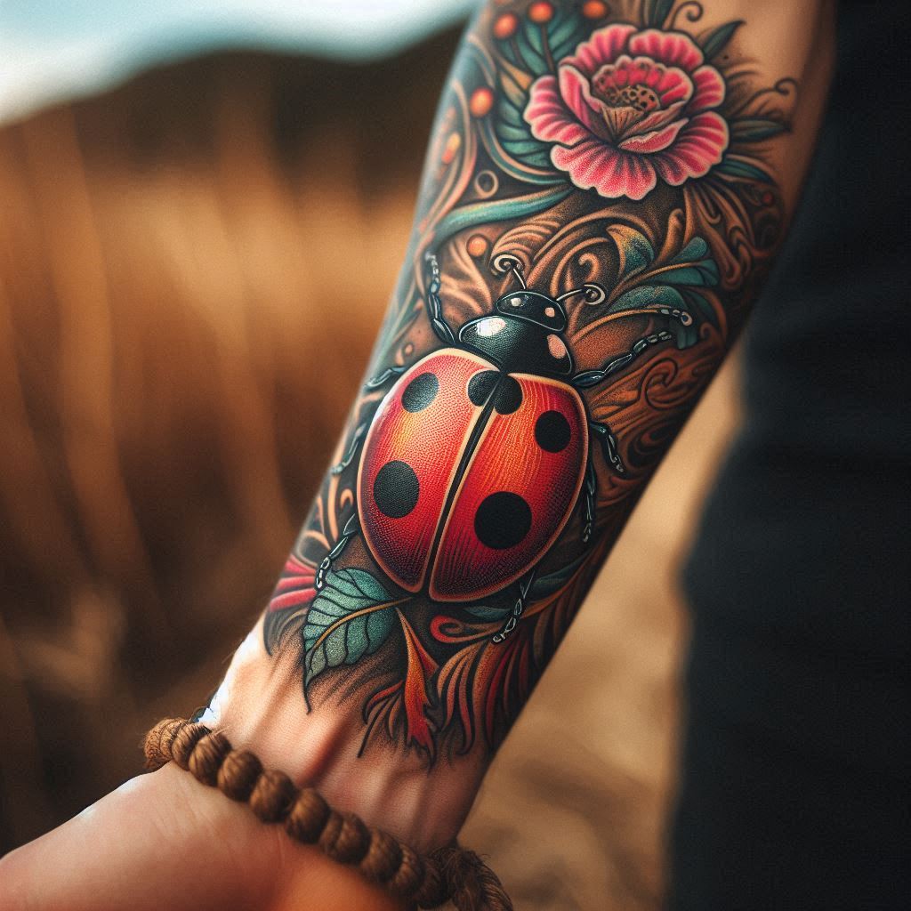 - Реализм и гиперреализм – тату в виде детального фотографического изображения божьей коровки в естественной среде (например, на листике клевера).