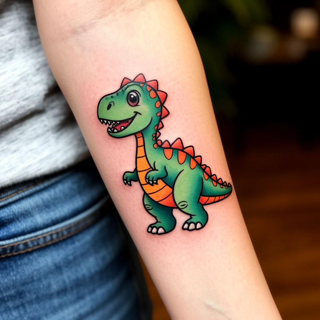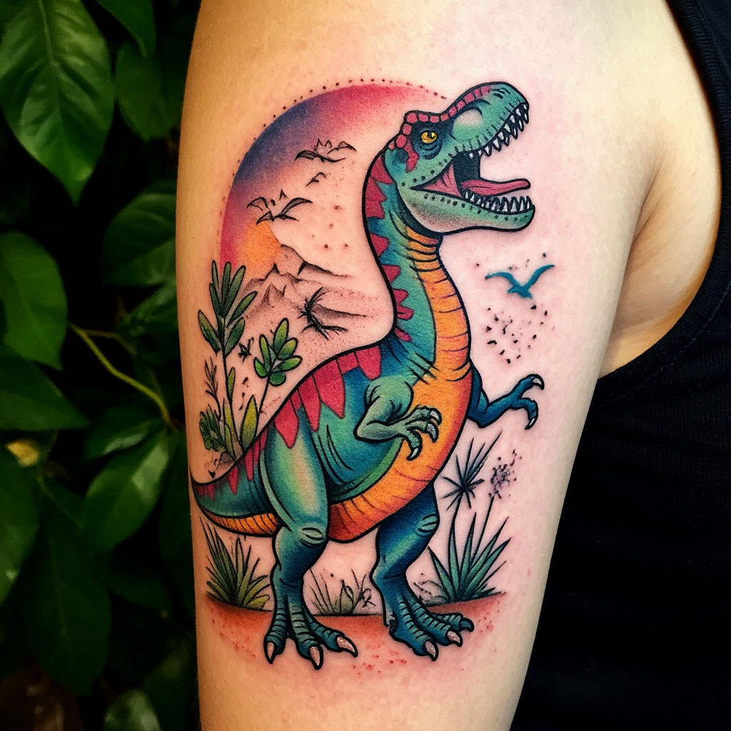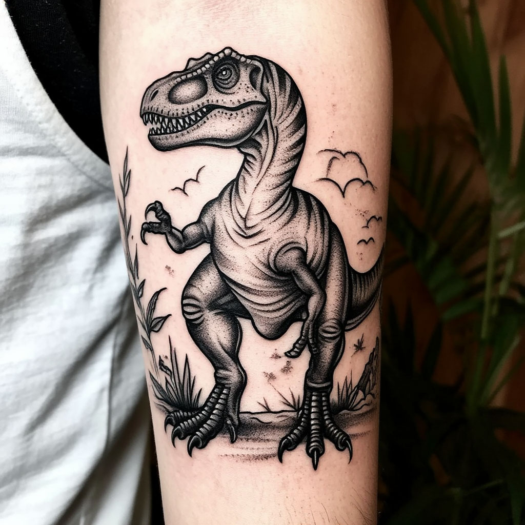 Тату динозавр выполняется в различных стилях и цветовых решениях, может быть дополнено элементами с символическим значением.