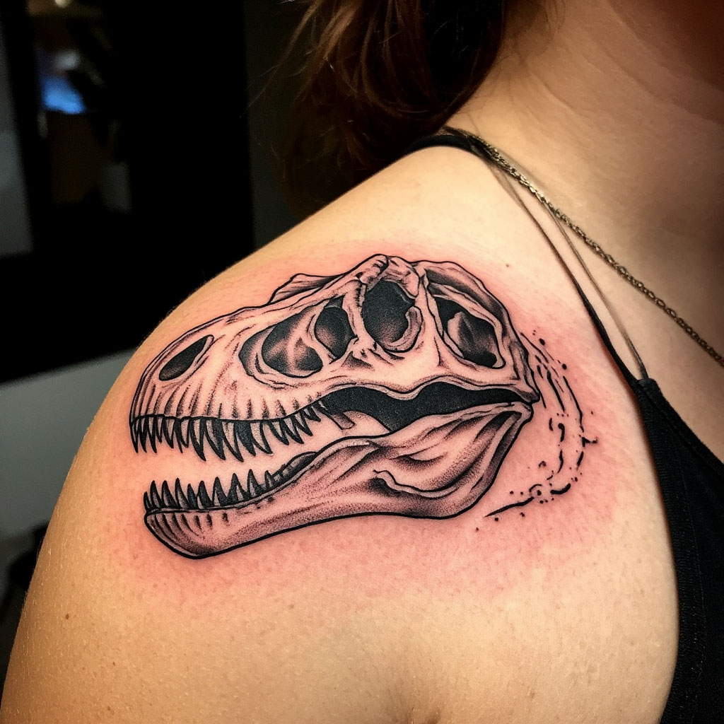 - Эскизы скелетов динозавра наносят люди, увлекающиеся музыкой в стиле панк-рок. Тату динозавра имеет значение вечности, несет некую агрессию.