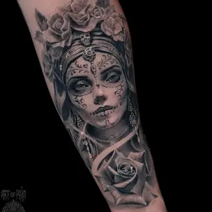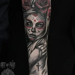 Под тату Санта Муэрте подразумевают оригинальное изображение раскрашенного черепа – Калаверу. С испанского слово так и переводится – «череп». Калавера – символ культового праздника Санта Муэрте – Святой Смерти. Его празднуют в Мексике, Гондурасе, Гватемале и Сальвадоре со времен майя и ацтеков 1 и 2 ноября. Жители этих стран верят, что души умерших родственников в эти дни возвращаются погостить среди живых.