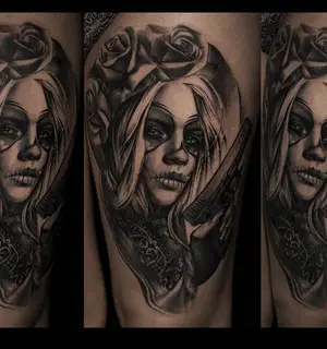 Эффектный вариант – тату с пчелами и ульем, выполненная в стиле реализм с тщательно проработанными деталями, насыщенными цветами, это выглядит красиво и напоминает фото. Крупноразмерные рисунки прекрасно смотрятся на груди, спине, бедре.