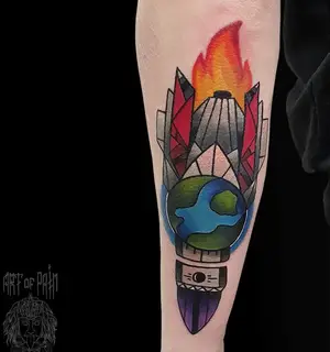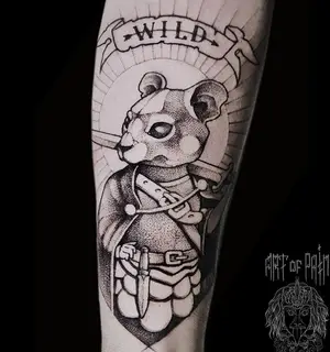 Молодежь охотно выбирает юмористические тату в стиле нью скул. Обычно эти сюжеты представляют собой композиции, сочетающие изображение насекомого, надпись, цветы. Небольшие рисунки в стиле дотворк размещают на запястье, щиколотке, задней части шеи.