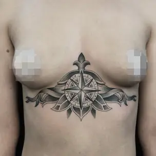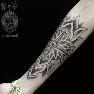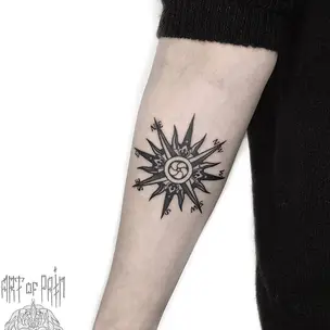Тату «роза ветров» не теряет популярности, благодаря символичности и загадочности. Это стилизованное изображение полярной звезды, лучи которой указывают на стороны света: север, юг, запад, восток. Четыре коротких луча – это промежуточные румбы. Лучей может быть от 4 до 16. Эскиз тату с розой ветров может включать также карту, перо, череп – от этого будет зависеть значение. Изображение красиво смотрится в цветном и черно-белом исполнении.
