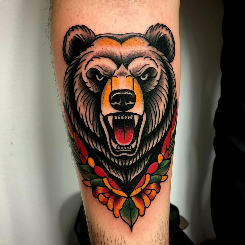 - Медведь – самый крупный хищник на российских просторах, знакомый с детства герой сказок и былин. В татуировке он часто соседствует с другими символами страны и передает патриотическую идею. Медведь – классика мужских тату, зверь, символизирующий отвагу, заботу о близких, возмездие, крепкую руку власти и могучую силу, которую лучше не тревожить.